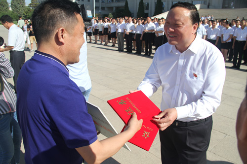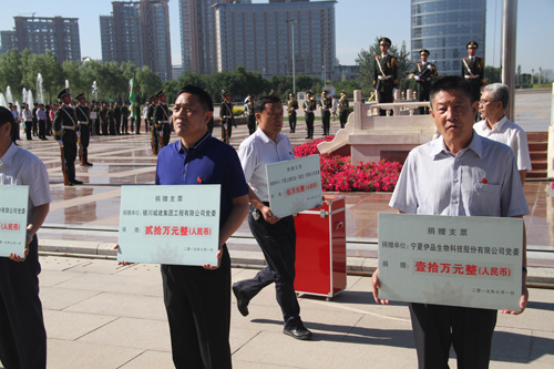 在當(dāng)日同時舉行的“銀川市黨內(nèi)關(guān)愛資金”捐款儀式上,集團(tuán)黨委捐款貳拾萬元。市委徐廣國書記給集團(tuán)公司雷光新董事長頒獎。